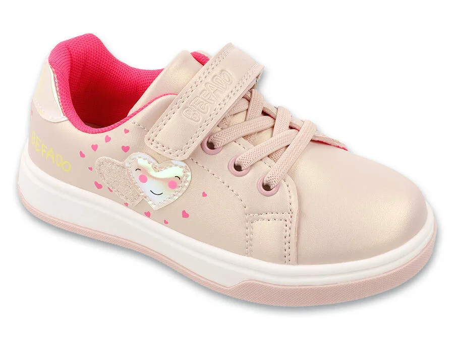 Kožená stélka Dívčí sportovní boty Heartsy Befado Dětská sportovní obuv Befado je praktická obuv určená pro každodenní nošení dětmi předškolního a školního věku. Je ideální na procházky, venkovní hry a další každodenní aktivity. Design boty umožňuje pohodlné přizpůsobení noze díky použití suchého zipu a elastických tkaniček, které umožňují nastavení a stabilní polohu nohy v botě. Uvnitř je kožená stélka, která zvyšuje pohodlí při používání a pomáhá udržovat správné hygienické podmínky pro dětské nožičky. Díky svému jednoduchému, sportovnímu designu se boty hodí k mnoha běžným dětským stylům. KLÍČOVÉ VLASTNOSTI: Kožená stélka – přírodní materiál šetrný k dětským nohám, Zapínání na suchý zip – usnadňuje dítěti obouvání a zouvání bot, Elastické tkaničky – stabilizují nohu a zlepšují padnutí, Flexibilní konstrukce podrážky – podporuje přirozený pohyb chodidla při chůzi, Sportovní vzhled – vhodný pro každodenní a aktivní nošení.