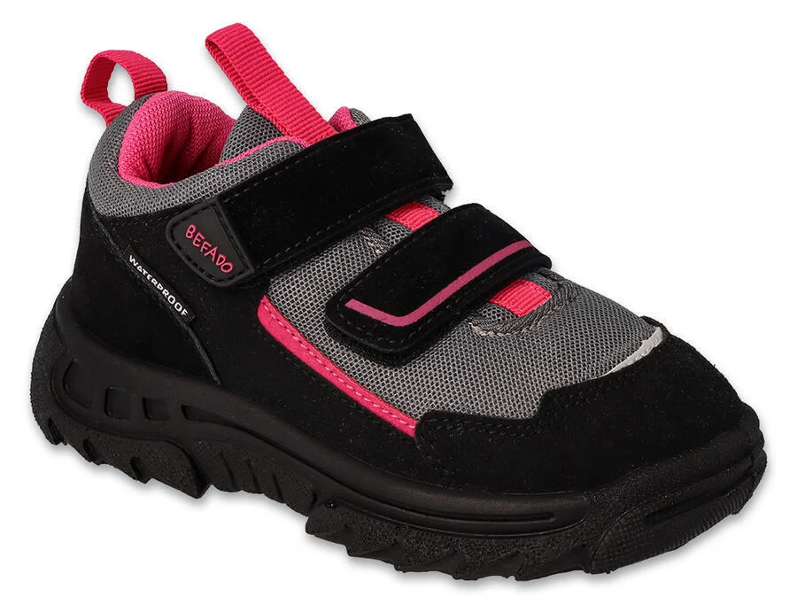 Lubisz spędzać czas z dzieckiem na wędrówkach po górskich szlakach? A może potrzebujesz wodoodpornego obuwia dla swojej pociechy, która spędza dużo czasu na świeżym powietrzu? Najnowszy model butów trekkingowych Befado dedykowany jest aktywnym dzieciom, które nie boją się szaleć nawet w deszczowe dni! Buty są wodoodporne, lekkie, mają odpowiednią przyczepność do podłoża i są stabilne. Podeszwa doskonale izoluje stopę od podłoża, dzięki czemu buty świetnie sprawdzą się w chłodniejsze dni. Wzmocniony zapiętek stabilizuje stopę, a przewiewny materiał buta gwarantuje swobodny dostęp powietrza. Buty trekkingowe Befado TREK WATERPROOF charakteryzują się: - wodoodporność, która sprawia, że buty nie przemakają podczas ulew i jesiennych deszczy; - wysokiej jakości materiał, którym jest syntetyczna imitacja skóry połączona z oddychającą siateczką; - praktyczne zapięcie na gumki i rzep ułatwiające zakładanie; - szeroki i wysoki nosek; - elastyczna, antypoślizgowa, lekka podeszwa PU, która gwarantuje bezpieczeństwo podczas wielu aktywności, doskonale izolując od zimnego podłoża. Idealne zarówno na codzienne spacery, jak i górskie aktywności. Zostały stworzone z myślą o aktywnych dzieciach.