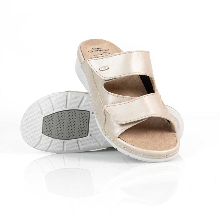 Damskie kapcie Batz Trudi. Dzięki swojemu czystemu kolorowi są idealnym wyborem. Z łatwością połączysz je z każdym strojem, nie musisz też rezygnować z wygody. Oprócz regulowanego paska na rzep, który pozwala na dopasowanie do stopy, specjalna elastyczna wkładka po wewnętrznej stronie buta sprawia, że jest on wygodniejszy dla osób z paluchem koślawym. Ponadto wyjmowane i wymienne wkładki są doskonale dostosowane do współczesnych wymagań, a jeśli chcesz naprawdę luksusowego doświadczenia, możesz nawet wykonać niestandardową wkładkę.