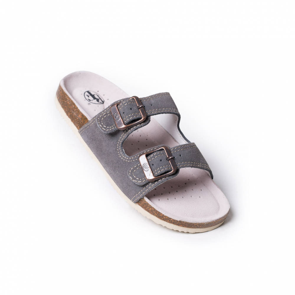 Szare skórzane kapcie z anatomicznie ukształtowaną oddychającą wkładką ze wsparciem łuku.