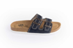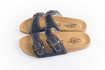 Skórzane kapcie w kolorze niebieskim z anatomicznie ukształtowaną oddychającą wkładką ze wsparciem łuku.