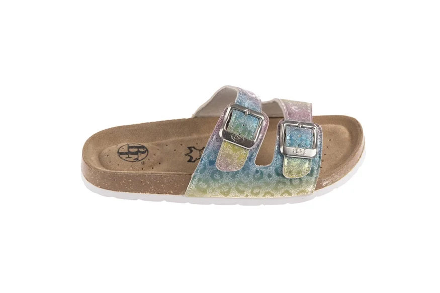 Skórzane kapcie w tęczowym brokacie z anatomicznie ukształtowaną oddychającą wkładką ze wsparciem łuku.