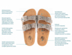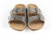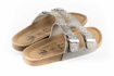 Skórzane pantofle ze srebrnym brokatem i anatomicznie ukształtowaną oddychającą wkładką ze wsparciem łuku.