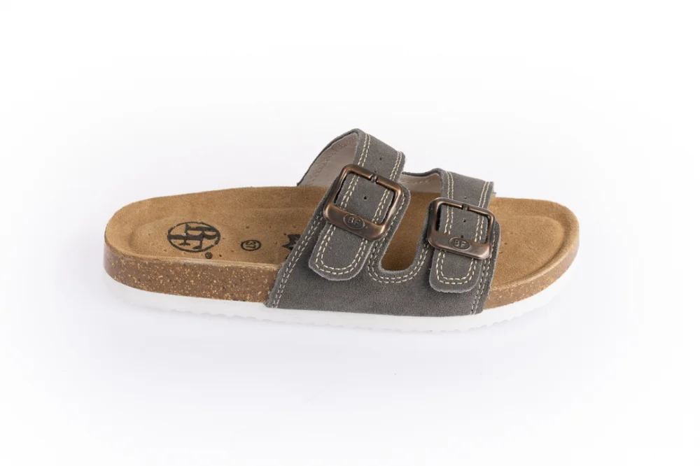 Szare skórzane kapcie z anatomicznie ukształtowaną oddychającą wkładką ze wsparciem łuku.