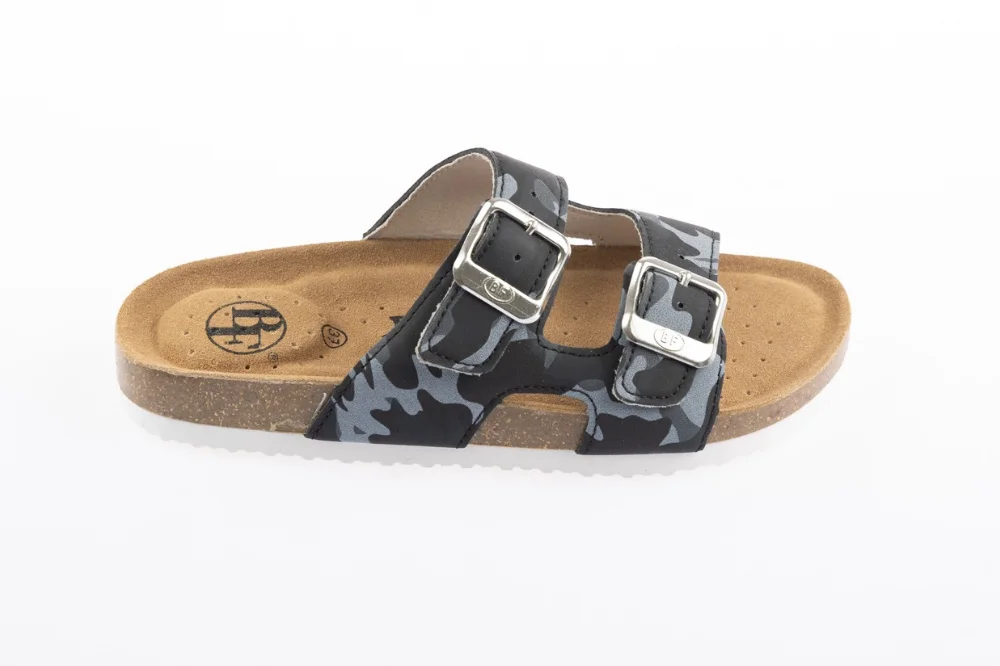 Czarno-szare skórzane kapcie w kamuflażu z anatomicznie ukształtowaną oddychającą wkładką ze wsparciem łuku.
