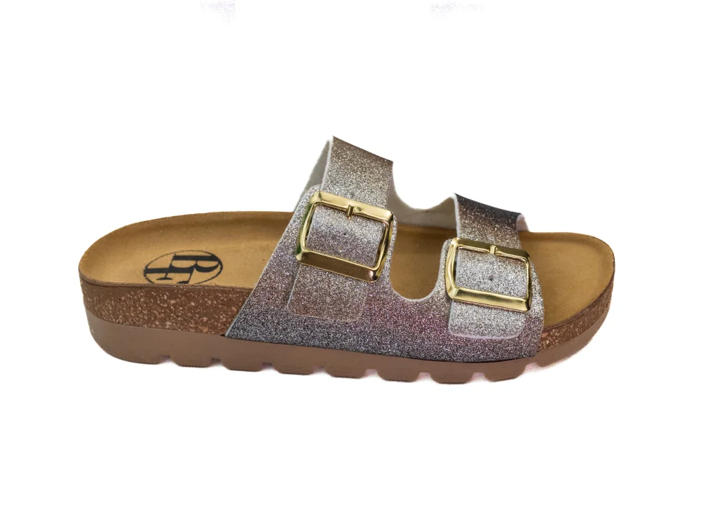 Brązowe brokatowe kapcie damskie na klinie