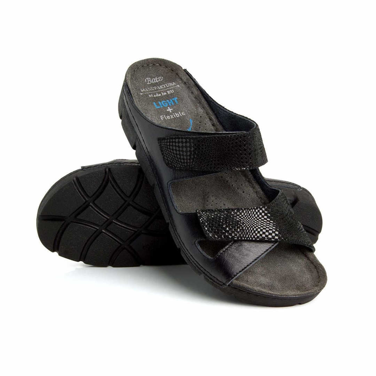 Batz Kapcie zdrowotne damskie Emilia Black - Skórzane kapcie zdrowotne Emilia posiadają lekką elastyczną podeszwę, dzięki zapięciom na rzep rozmiar jest regulowany w okolicy kostki.