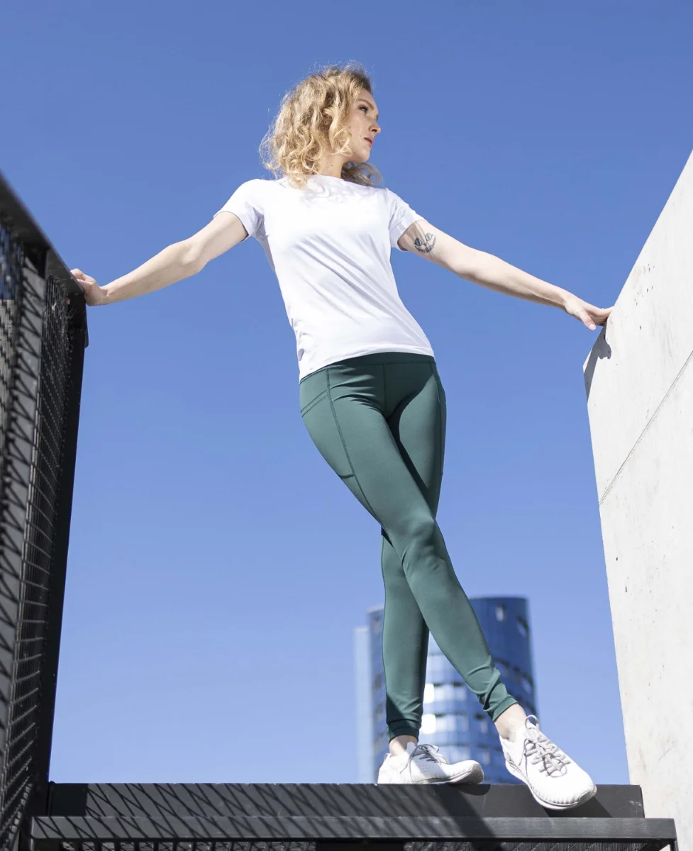 Damskie legginsy sportowe ze wzmocnioną talią, opracowane specjalnie dla kobiet. Dzięki zastosowaniu technologii szerszego pasa, idealnie dopasowują się do sylwetki, a praktyczne kieszenie w szwie bocznym pozwalają na wygodne przechowywanie drobnych przedmiotów. Szczotkowany nylon jest lekki, oddychający, przyjemny w dotyku i maksymalnie dopasowany. Legginsy są doskonałym wyborem do uprawiania sportu i spędzania wolnego czasu.