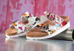 Damskie botki z korka z podwyższoną piętą, skórzana cholewka z kwiatowym nadrukiem.