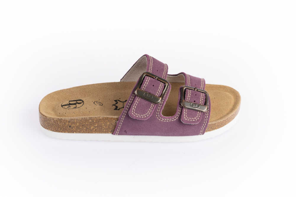 Skórzane kapcie w kolorze fioletowym z anatomicznie ukształtowaną oddychającą wkładką ze wsparciem łuku.