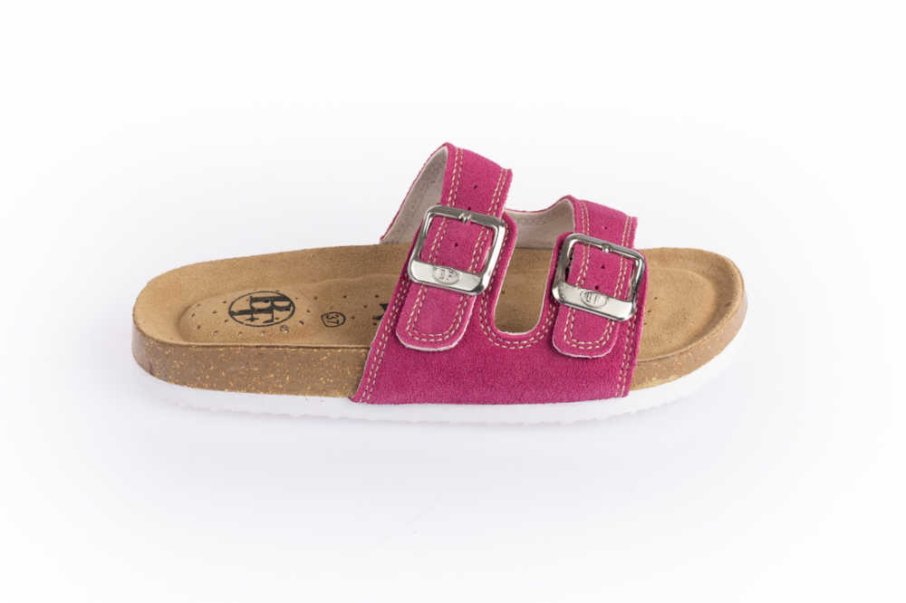 Różowe skórzane kapcie z anatomicznie ukształtowaną oddychającą wkładką ze wsparciem łuku.