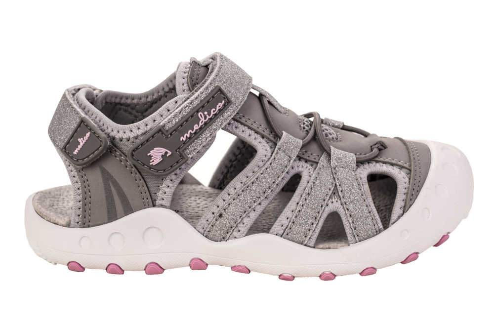 Sandał dziecięcy ze skórzaną wkładką i cholewką ze sztucznej skóry. But ma elastyczną podeszwę sportową z ochronną osłoną palców. Szerokość buta można regulować dzięki rzepowi na podbiciu, a następnie na pięcie. But pięknie dopasowuje się do stopy i można do niego włożyć wkładkę ortopedyczną.