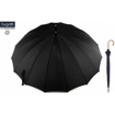 Bugatti Doorman czarny - klasyczny męski parasol. Luksusowy uchwyt z litego drewna. Elegancki kształt dachu parasola z 16-drutowym stelażem z włókna szklanego. Wytrzymały, wiatroodporny.