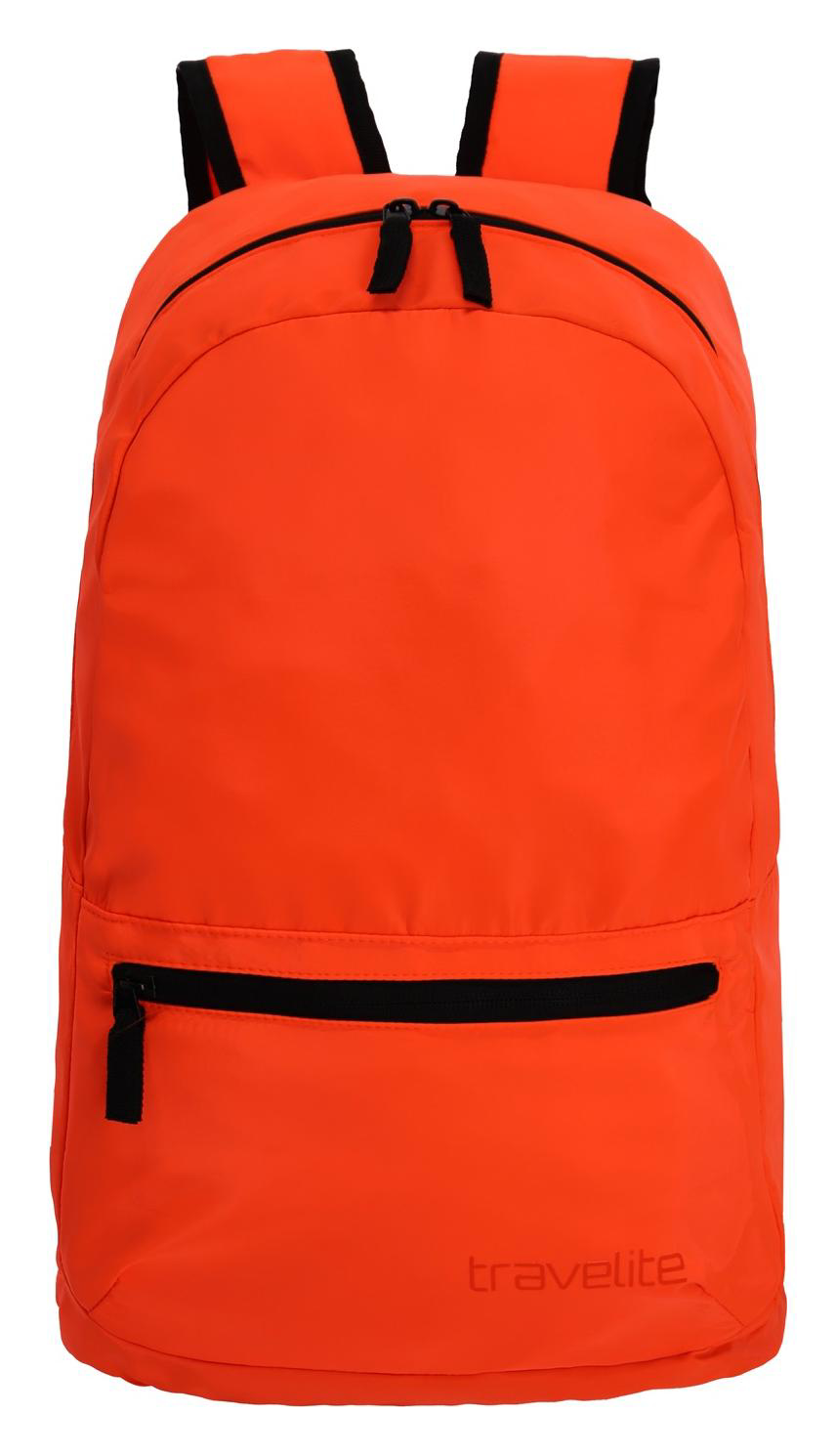 Składany plecak z materiału z przednią kieszenią zapinaną na zamek.