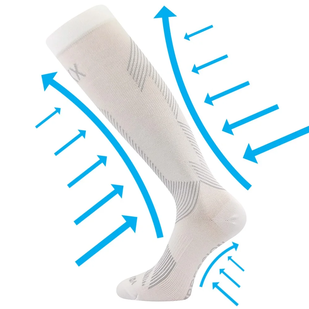 Skarpety uciskowe VoXX® EDICT mają specjalną konstrukcję dla zdrowia. Mają pozytywny wpływ na krążenie krwi dzięki stopniowanemu uciskowi masującemu. Są szczególnie przydatne w przypadku zbyt dużego obciążenia kończyn dolnych. Nadają się do uprawiania sportów, podczas których mięśnie szybciej się regenerują, zwiększa się przepływ krwi, a mięśnie są lepiej dotlenione. Skarpety uciskowe VoXX® są również odpowiednie do długotrwałego stania lub, przeciwnie, do długotrwałego siedzenia w pracy lub długotrwałego podróżowania różnymi środkami transportu. Sportowe skarpety uciskowe działają również jako profilaktyka przeciwżylakowa. Kolejną zaletą jest ochrona antybakteryjna z jonami srebra w materiale silproX®, a dzięki wysokiej zawartości wiskozy bambusowej skarpetki doskonale wchłaniają wilgoć i są przyjemne dla skóry.