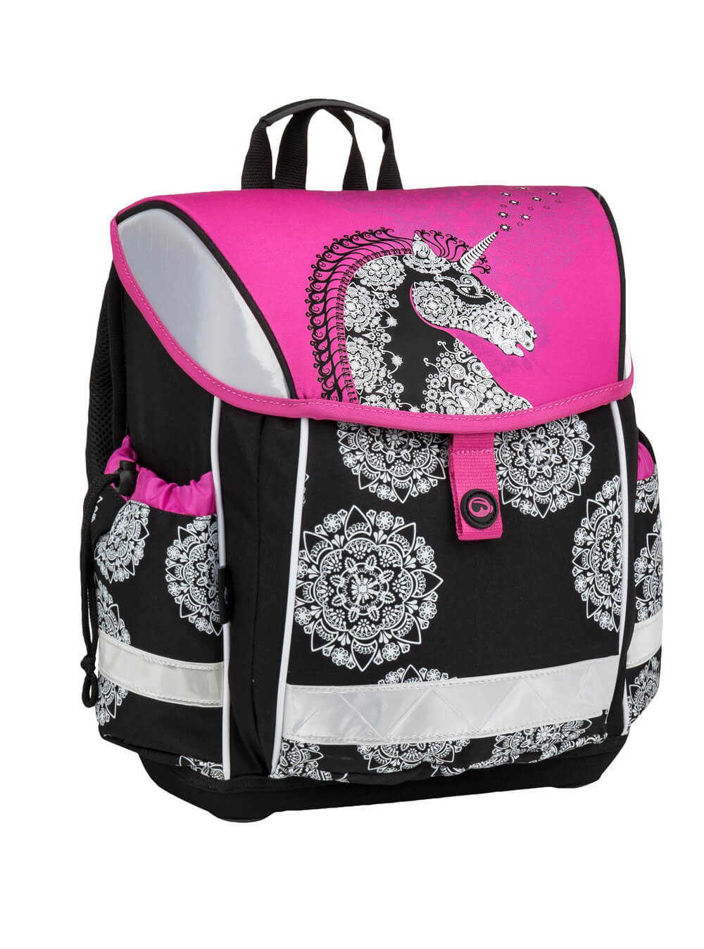 Jednokomorowa teczka dla uczniów klas 1-2 szkoły podstawowej. Pojemna z przednią kieszenią. Przezroczysta komora główna, wewnętrzny podział, boczne kieszenie na butelki, stabilne solidne dno, plastikowe nóżki. Zapięcie na metalowy zamek z odblaskiem. Elementy odblaskowe zgodne z normami EU/EN.