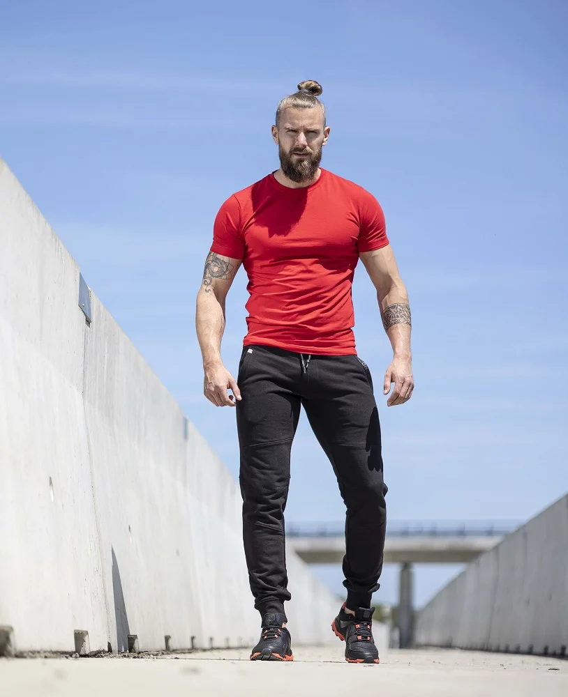 Męskie lekkie spodnie dresowe, talia i nogawki wykonane z elastycznego ściągacza, boczne kieszenie zapinane na zamek, tylna kieszeń zapinana na zamek.