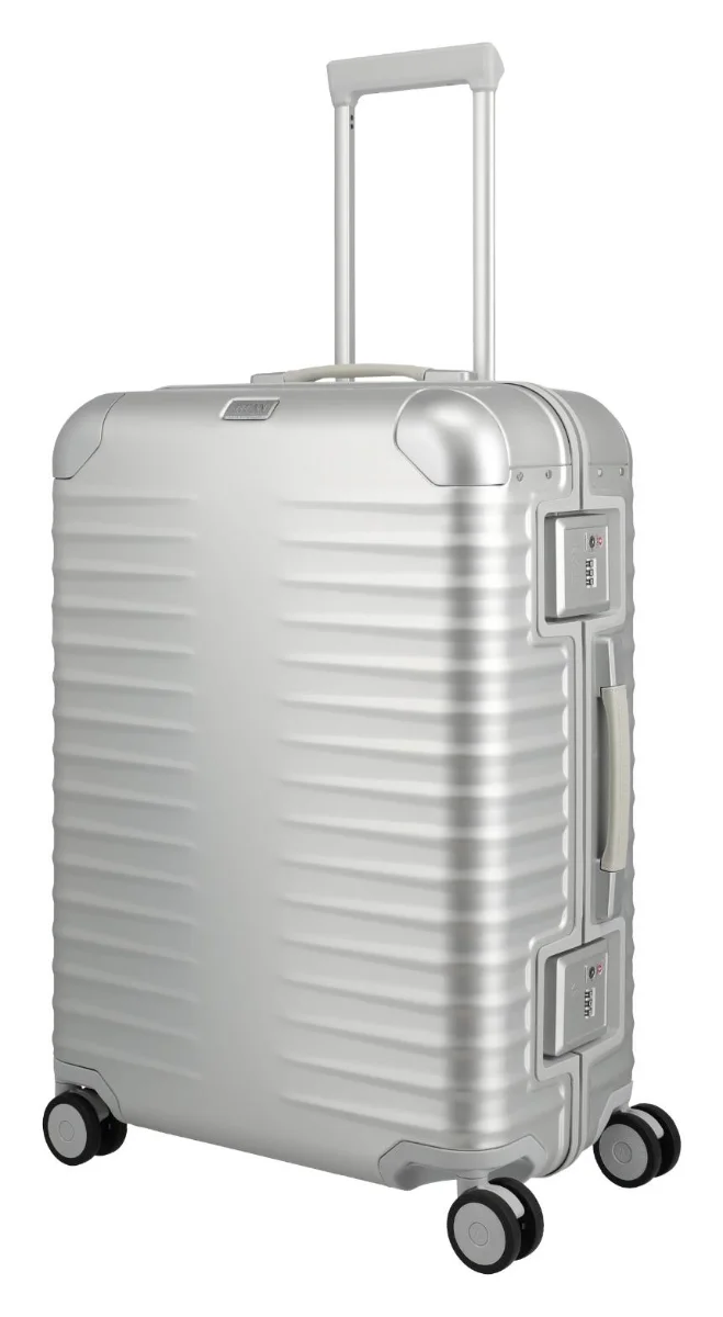 Luxusní hliníkový kufr střední velikosti s kvalitní rámovou konstrukcí Titan Smart, dvěma TSA zámky, vyjímatelnou vnitřní přepážkou a čtyřmi prémiovými kolečky s kuličkovými ložisky. Vyroben v Německu.