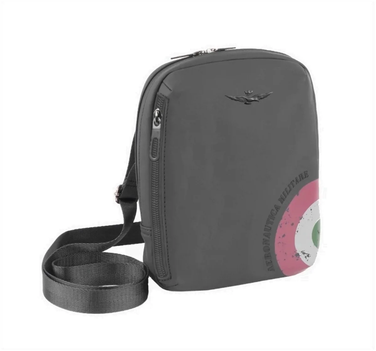 Stylowa torba na ramię lub crossbody na rzeczy osobiste prestiżowej marki Aeronautica Militare z serii Runway w popularnym czarnym kolorze. Torba ma wygodne wymiary i pomieści wszystkie niezbędne rzeczy, takie jak portfel, telefon komórkowy, dokumenty i klucze. Torebka cross bag z technicznego gumowanego materiału to idealny wybór dla osób poszukujących połączenia funkcjonalności, sportowej elegancji i włoskiego stylu. To stylowe akcesorium uosabia unikalny charakter marki Aeronautica Militare i zostało zaprojektowane tak, aby wytrzymać niekorzystne warunki pogodowe. W górnej części znajduje się subtelne logo marki, a dolna część jest ozdobiona odważną grafiką z włoskim trójkolorowym motywem i napisem Aeronautica Mil itare, podkreślając jej ekskluzywny wygląd.