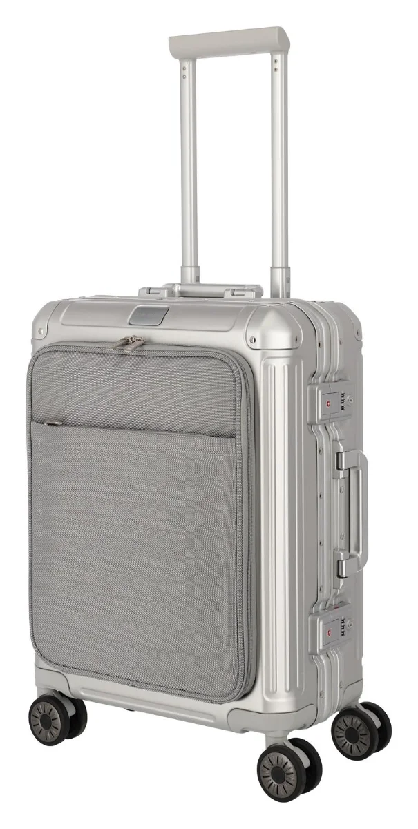 Wyjątkowo wytrzymała walizka pokładowa z aluminiową ramą na czterech kółkach, zamknięciem zatrzaskowym ze zintegrowanymi zamkami TSA i przednią kieszenią na laptopa z tkaniny.