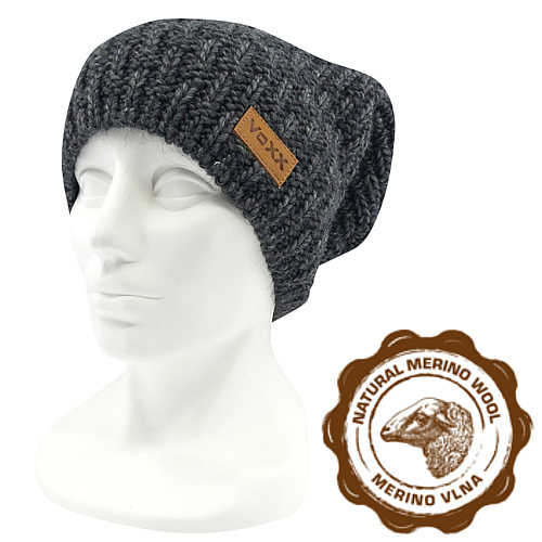 - damska czapka z dzianiny z wełną merynosów, ozdobiona skórzaną metką VoXX®, wewnątrz mikropolar