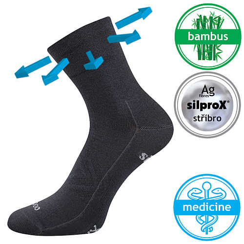 - damskie i męskie skarpety sportowe, dodatkowo wzmocniona stopa przed ścieraniem, specjalny - wyjątkowo luźny, nieuciskający ściągacz, palce zakończone łańcuszkiem, materiał bambusowy z naturalną ochroną antybakteryjną, ochrona antybakteryjna jonami srebra w materiale silproX, klasa temperaturowa: A