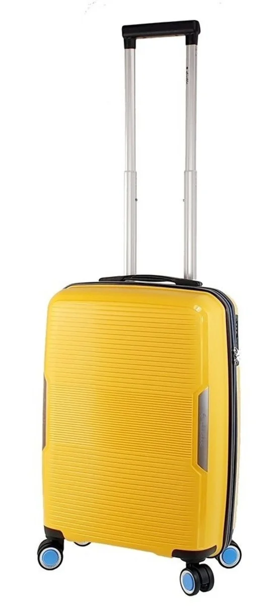 Nowoczesna ultralekka plastikowa walizka 55 cm włoskiej marki Dielle w kolorze żółtym z paskami.